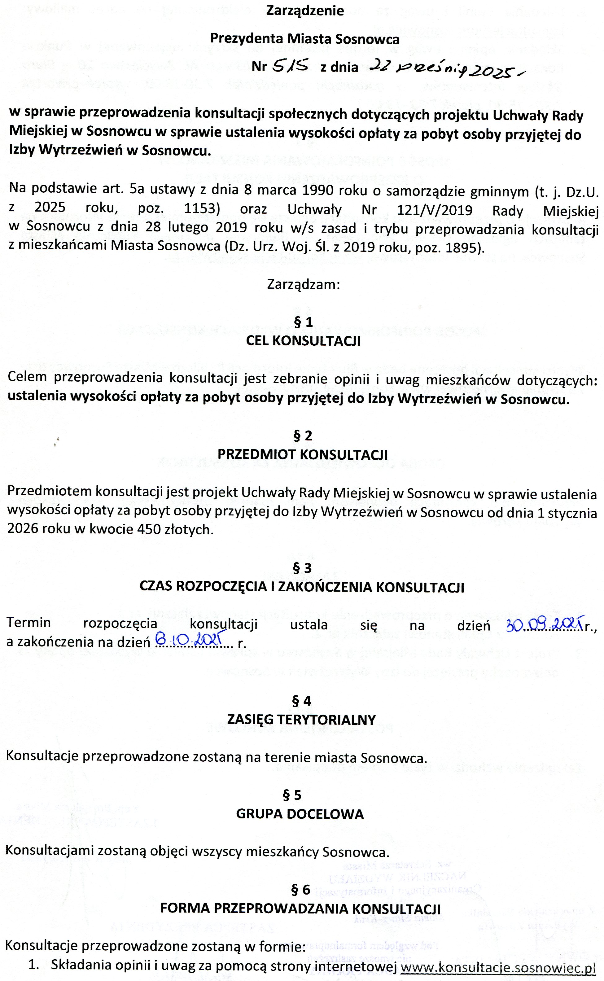Na podstawie art. 5a ustawy z dnia 8 marca 1990 roku o samorządzie gminnym (t. j. Dz.U. z 2025 roku, poz. 1153) oraz Uchwały nr 121/V/2019 Rady Miejskiej w Sosnowcu z dnia 28 lutego 2019 roku w/s zasad i trybu przeprowadzania konsultacji z mieszkańcami Miasta Sosnowca (Dz. Urz. Woj. Śl. z 2019 roku, poz. 1895).