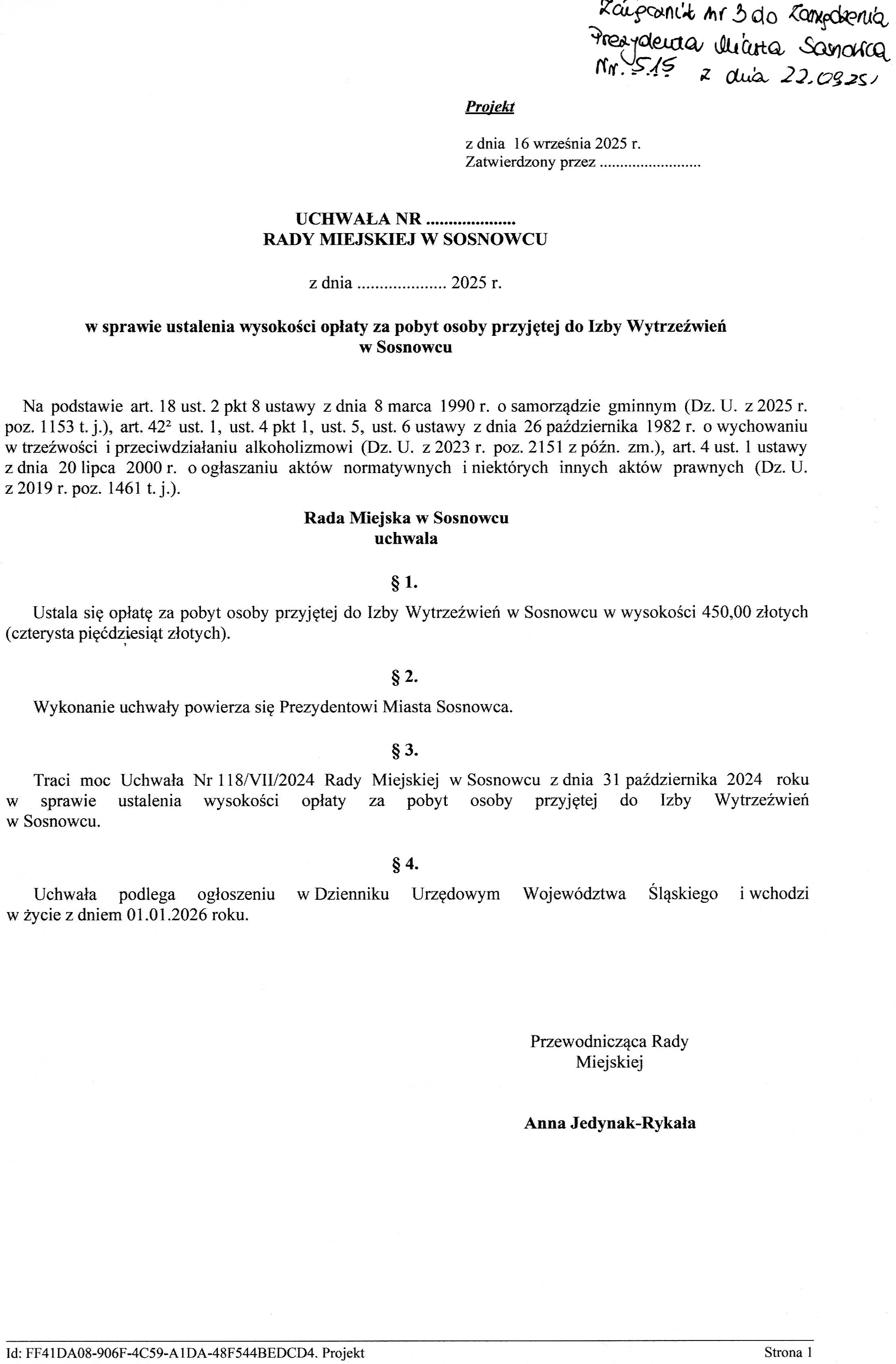 Projektu Uchwały Rady Miejskiej w Sosnowcu w sprawie ustalenia wysokości opłaty za pobyt osoby przyjętej do Izby Wytrzeźwień w Sosnowcu