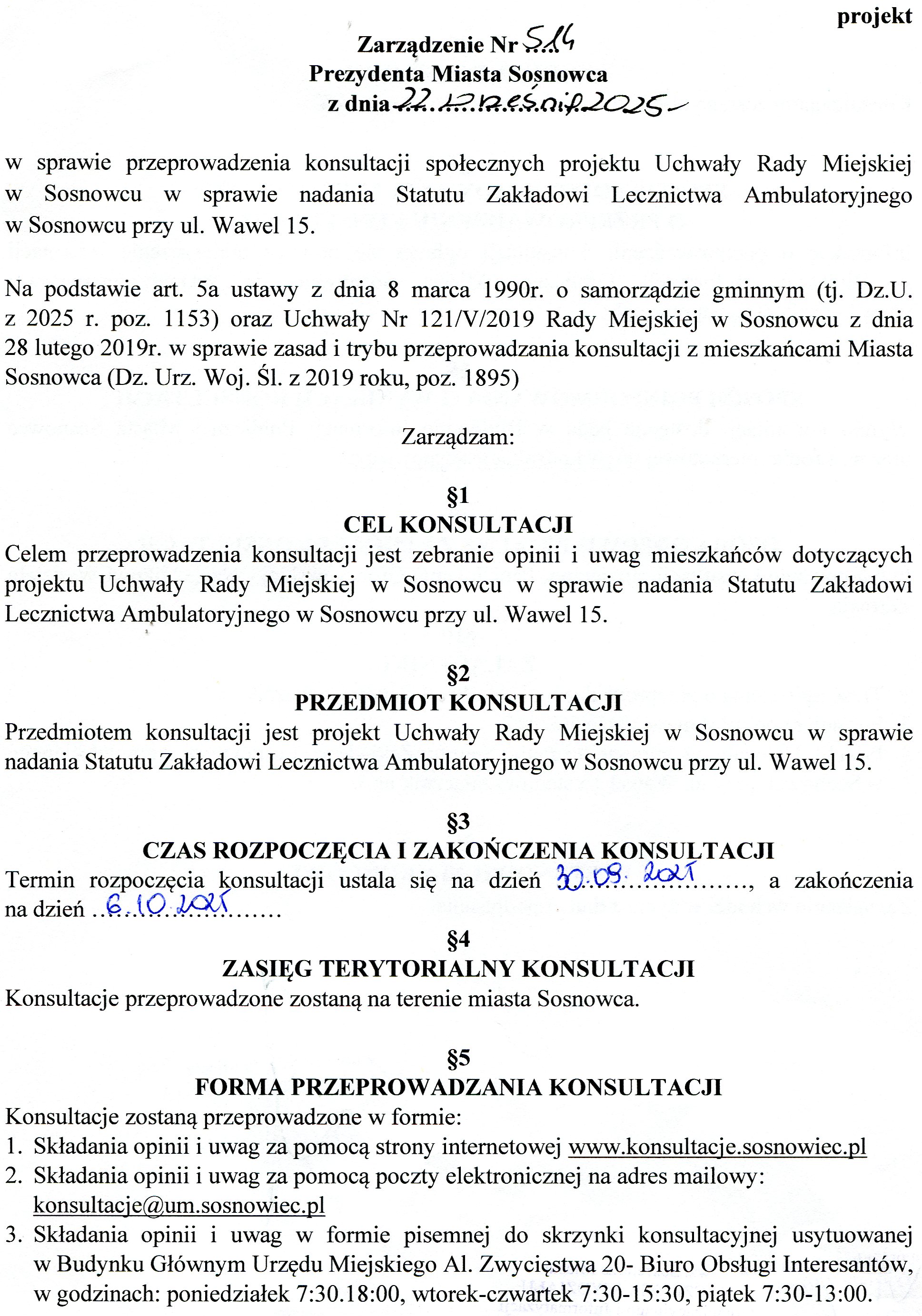 Na podstawie art. 5a ustawy z dnia 8 marca 1990r. o samorządzie gminnym (tj. Dz.U. z 2025r. poz. 1153) oraz Uchwały Nr 121/V/2019 Rady Miejskiej w Sosnowcu z dnia 28 lutego 2019r. w sprawie  zasad i trybu przeprowadzania konsultacji z mieszkańcami Miasta Sosnowca (Dz. Urz. Woj. Śl. z 2019 roku, poz. 1895).